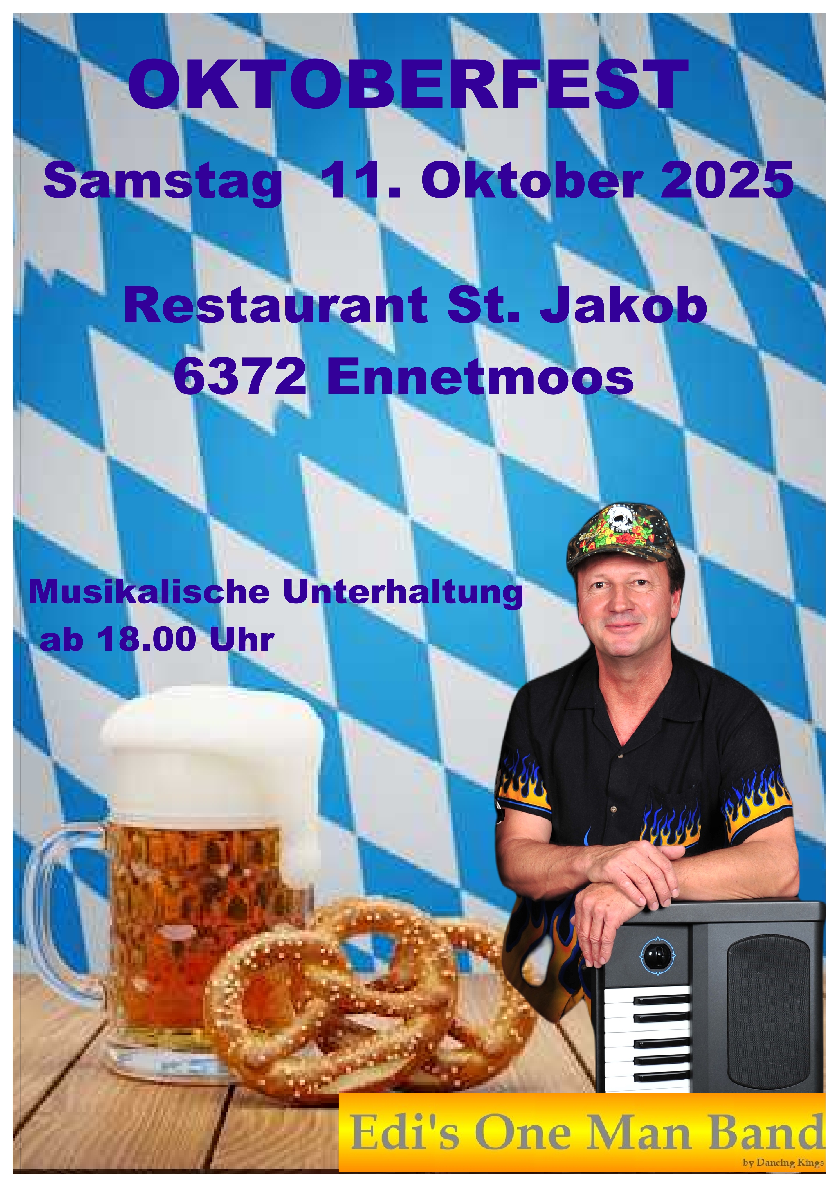 | Samstag 11. Oktober 2025 ab 18.00 Uhr Öffentlicher Anlass Restaurant St. Jakob 6372 Ennetmoos OKTOBERFEST |